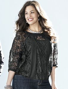 3/4 sleeve top makes an ultra feminine addition to your layering wardrobe with sheer lace striped with chiffon insets. Curve-flattering cut features a boat neckline and elastic bubble hem. Designed for layering so you can create endless customized looks.